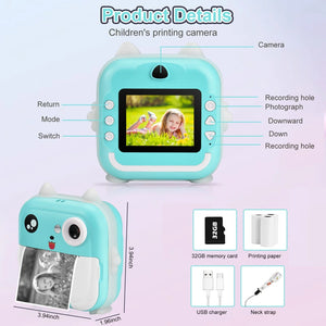 Aparat foto digital cu imprimare termica pentru copii, focalizare automata, display color de 2,4 inch 1080P Full HD