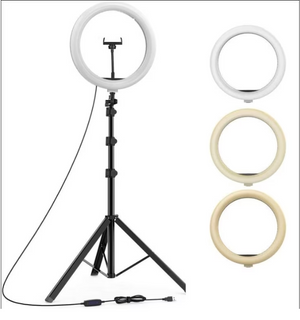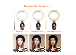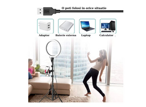 Lampa circulara cu 10 trepte lumina, telecomanda pe fir, trepied inclus. Este ideala pentry make-up artisti, cosmetica, selfie-uri, filmari si fotografii de grup in conditii de luminozitate scazuta, perfecta si pentru fotografi, bloggeri, vloggeri.