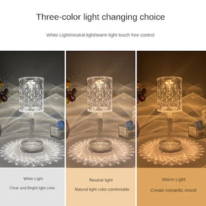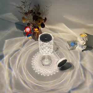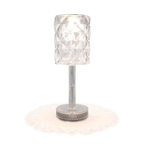 Lampă decorativă cu design de cristal de iluminare albă, caldă, rece, naturală cu suprafață tactilă activată/dezactivată. Are o baterie reincarcabila care se incarca prin USB si o durata de functionare de 5 ore.