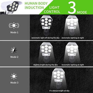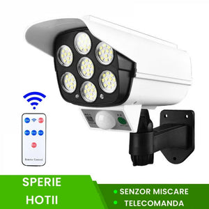 Lampa solara tip camera falsa cu panou solar teleconanda si senzor de miscare, dispune de 7 surse SMD - deci de 77 Led-uri SMD luminoase.